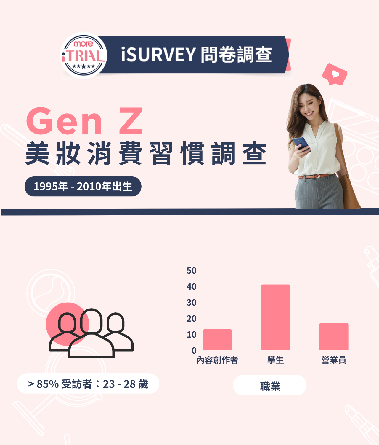Z世代(Gen Z) 泛指於1995年至2010年間出生的一代,是全球人口比例最多的世代,在香港Gen Z佔總人口比例達到 16%。MORE 旗下的美妝用家分享平台iTRIAL 於 2023 年3 月在香港進行一項「Gen Z 美妝消費習慣問卷調查」,透過網上問卷訪問了超過 200 位於1995年至2010年出生的Gen Z 會員,透過調查,我們更深入了解Z世代為美妝消費生力軍的趨勢和轉變,當中重點: