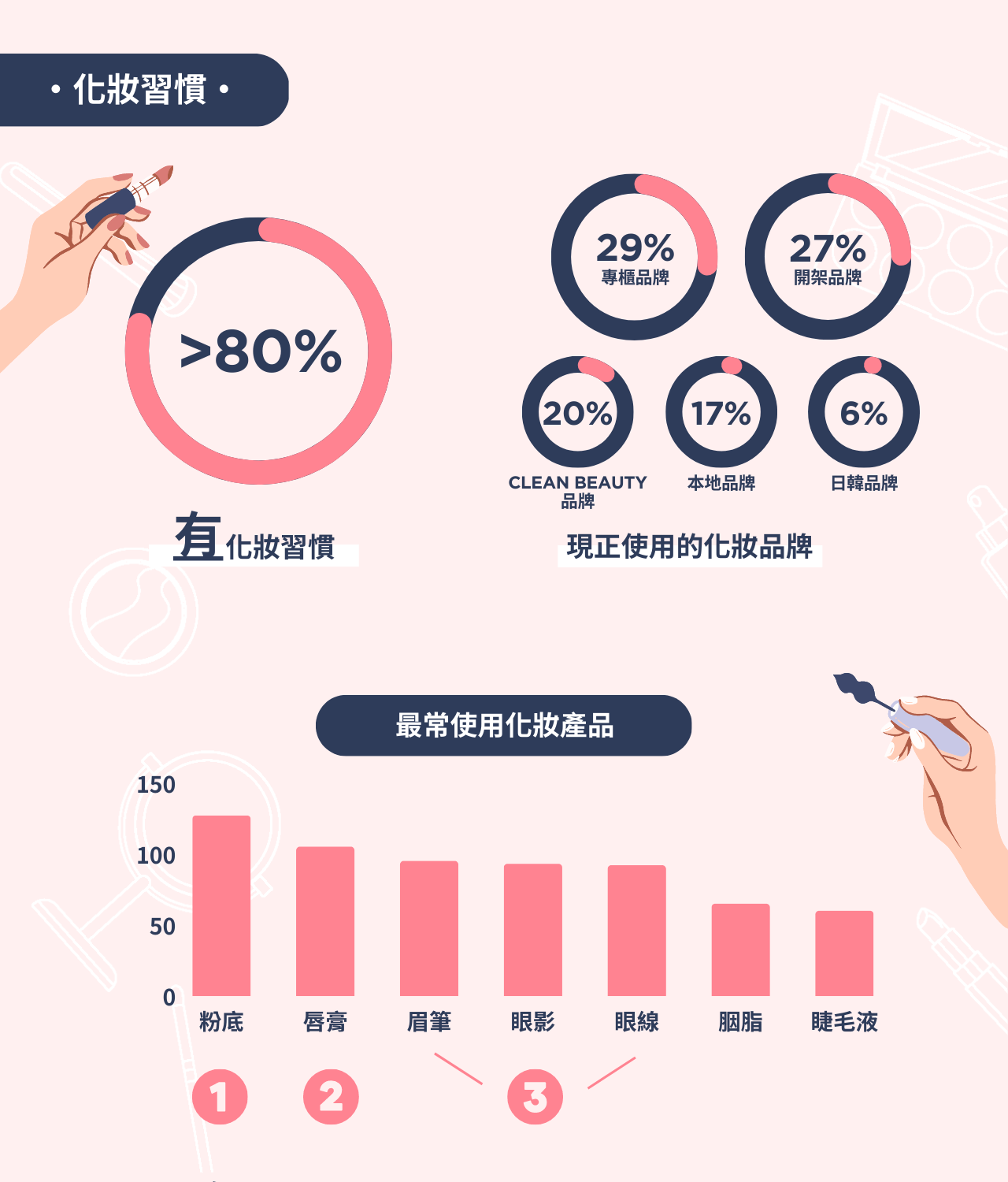 Gen Z 對外表要求嚴格,出門化妝已成常態,超過80%的Gen Z 受訪者有化妝習慣,除底妝外,最重視眼妝效果。她們最想使用的化妝品依次為「粉底」(19.9%)、「唇膏」(16.5%) 和「眉筆和眉粉」(14%)。於化妝品選擇上,GenZ較著重性價比,沒有特定使用的品牌,無論專櫃品牌、開架品牌或時裝品牌的化妝系列都會買。