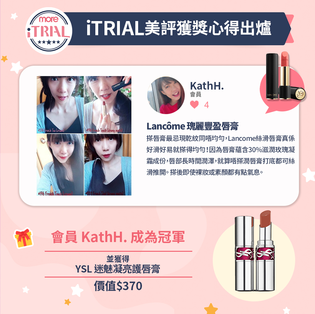 4.iTRIAL美評保有最終修改、變更、活動解釋及取消本活動之權利,若有相關變動將於iTRIAL美評網頁公告, 恕不另行通知。
