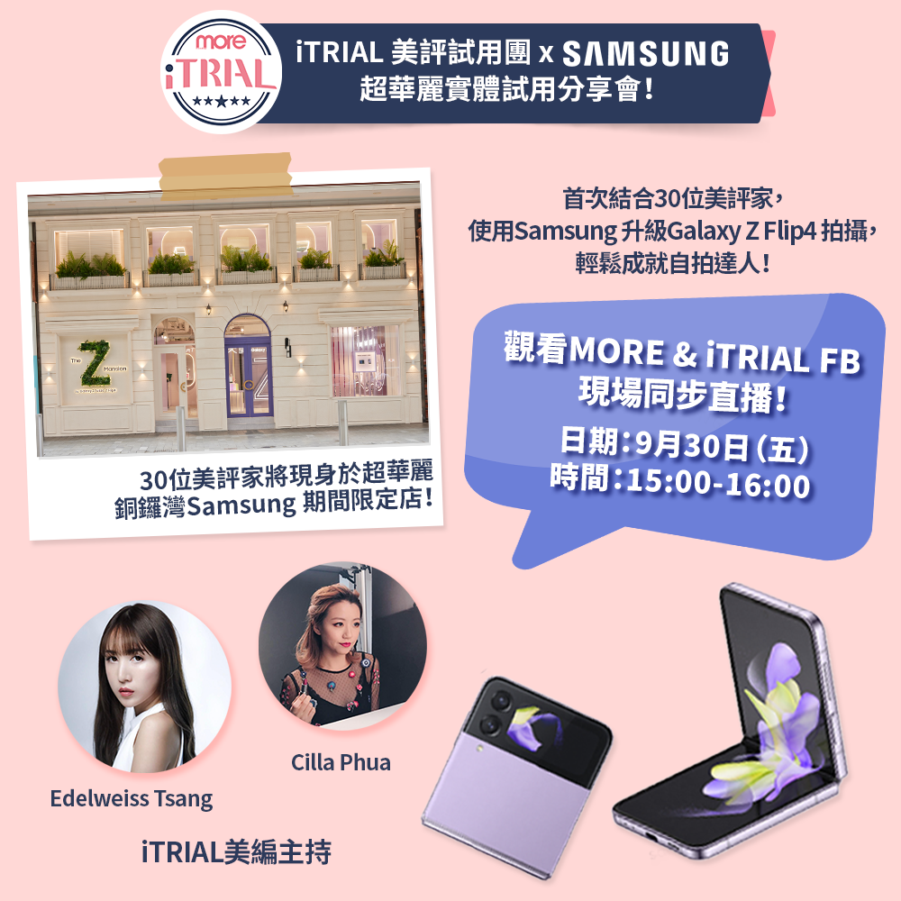 成日羨慕IG女神影相好靚好有仙氣😍,自己又影極都唔靚🥲?咁你一定要留意住嚟緊9月30日 3-4pm嘅💖MORE & iTRIAL美評Facebook雙台首播💖,2位美編主持破天荒為30位美評家示範用🏆本年度最強自拍手機🌟Galaxy Z Flip4🌟,即使一個人都可以用Z Flip4自拍勁多靚相🤩!
