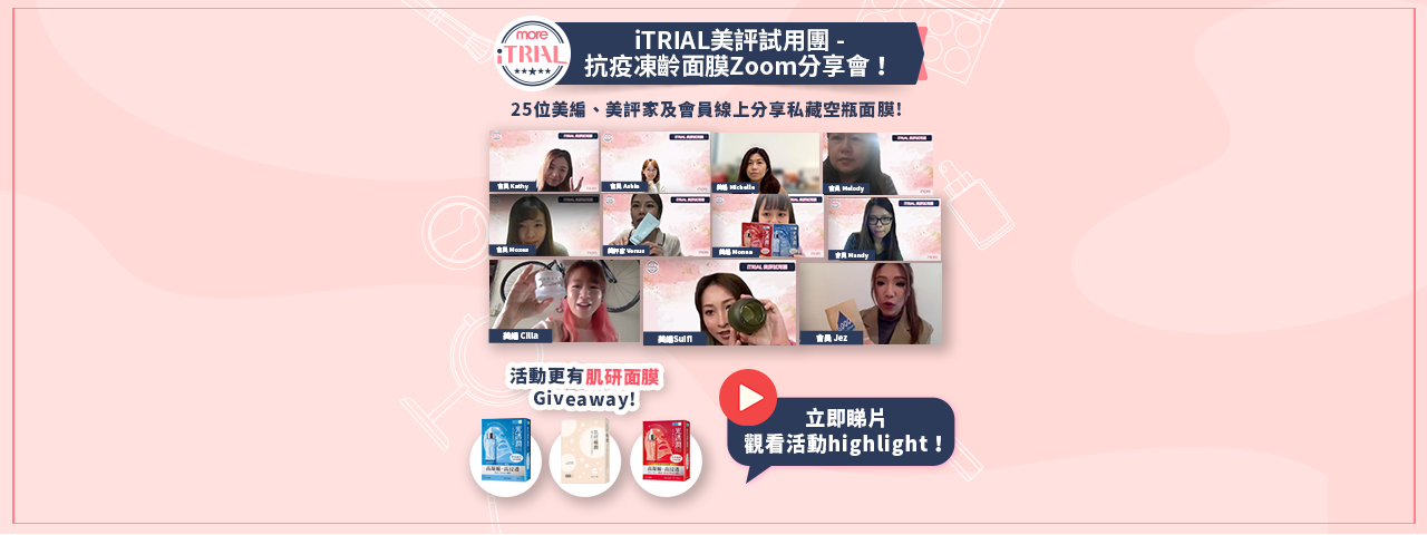 iTRIAL於3月24日成功舉辦了「iTRIAL美評試用團 - 抗疫凍齡Zoom面膜分享會」,當中我們邀請了美編Cilla及Monna作活動主持,與21位iTRIAL美評家和活躍會員一起線上討論各種敷面膜迷思,以及如何在抗疫期間在家勤力護膚。活動中各人更大方分享了自己使用面膜的貼士和推介各大品牌空瓶多次的家用面膜,在家享受美容院級護膚待遇無難度!