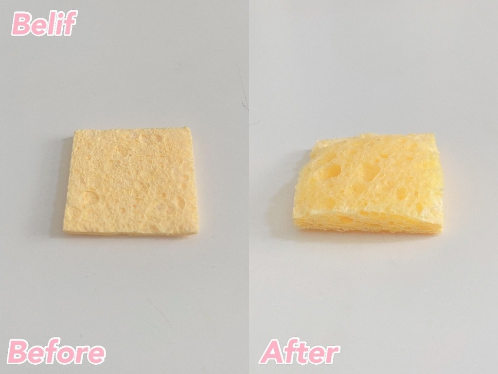 | 吸收度 | 將保濕精華擠在脫水壓縮過的木漿海綿,5分鐘後觀察海綿的膨脹程度,以實測吸收力。 |