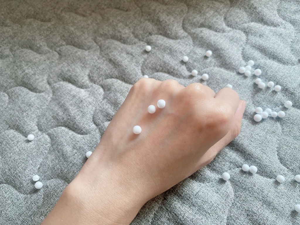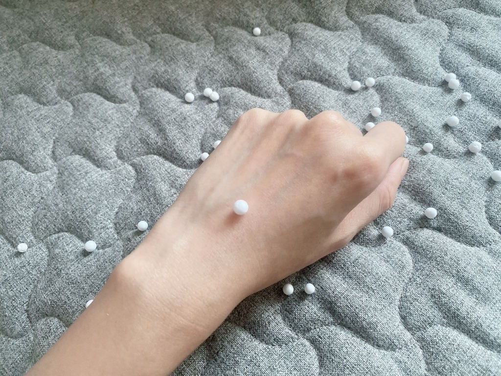 | 清爽度 | 將保濕精華均勻塗於手背,1分鐘後灑上發泡膠粒,沾上的發泡膠粒愈少,清代表清爽度愈高。 |