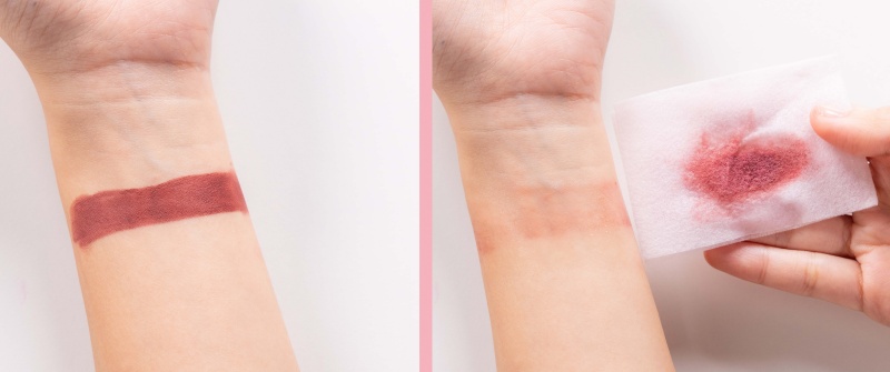易卸度:利用沾滿眼唇卸妝液的化妝棉在唇膏位置來回擦拭5次,查看殘留情況。