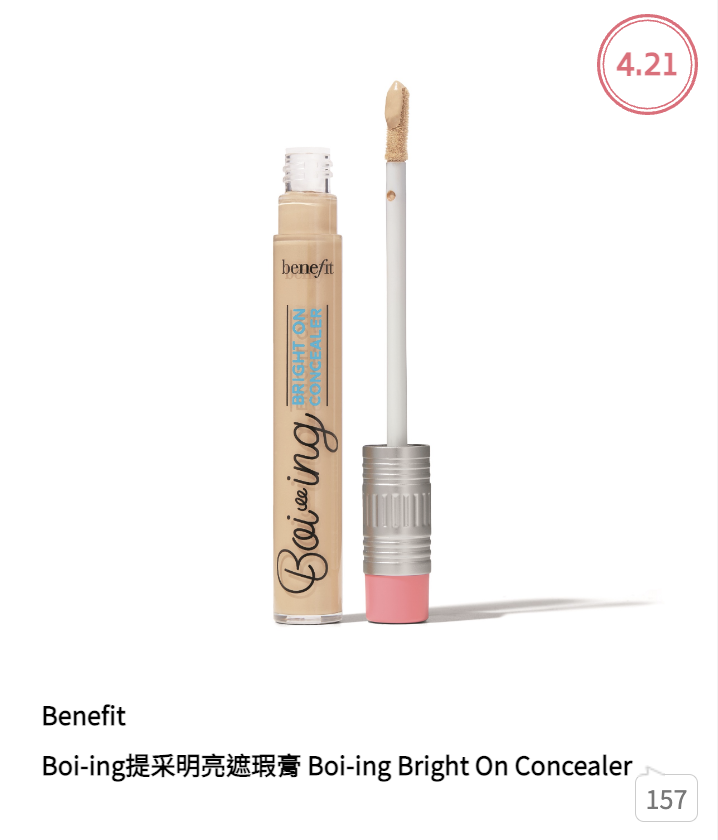 5月iTRIAL會員最多好評第4名是Benefit Boi-ing提采明亮遮瑕膏 ,5月新增了28篇產品評價,累積共157篇評論,總評分4.21分。