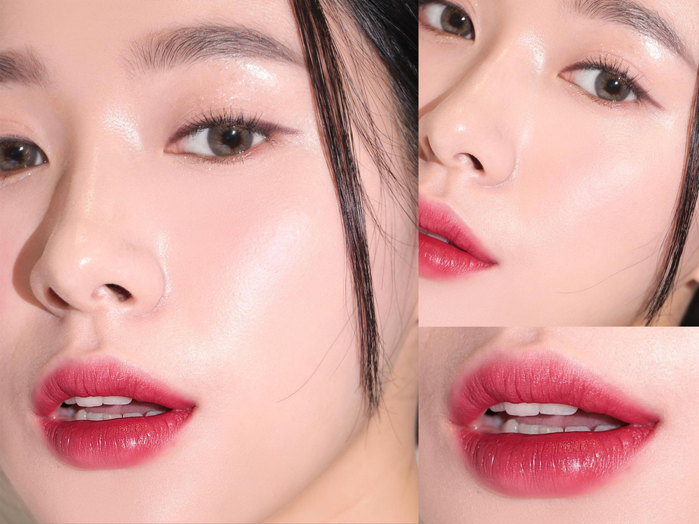 化上簡單乾淨的底妝後,塗上柔霧感的莓紅色唇釉,趁未乾透時用棉花棒把唇部邊緣部分推鬆,做出模糊唇線的效果,時尚又容易carry。