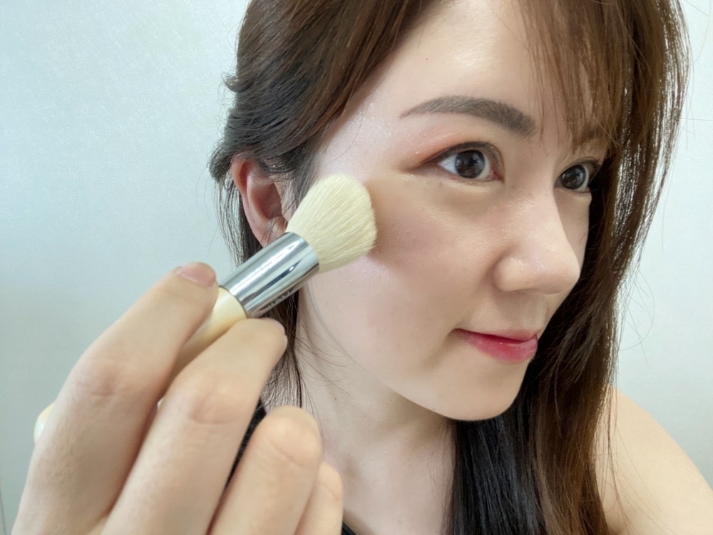 粉粒幼細,在眼尾的倒C位置、鼻樑及下巴,逐少掃上,質感幼滑。