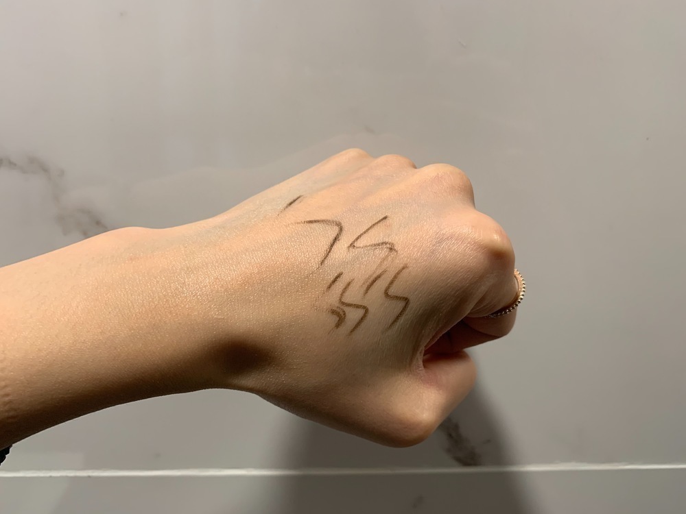 將畫上眼線的手在水下沖一段時間後,眼線仍然完整無缺。