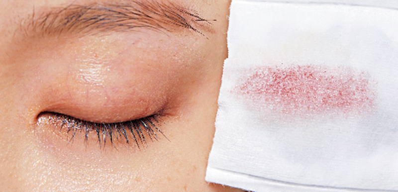 3:以沾滿了卸妝水的化妝棉輕抹眼蓋,測試其易卸度。